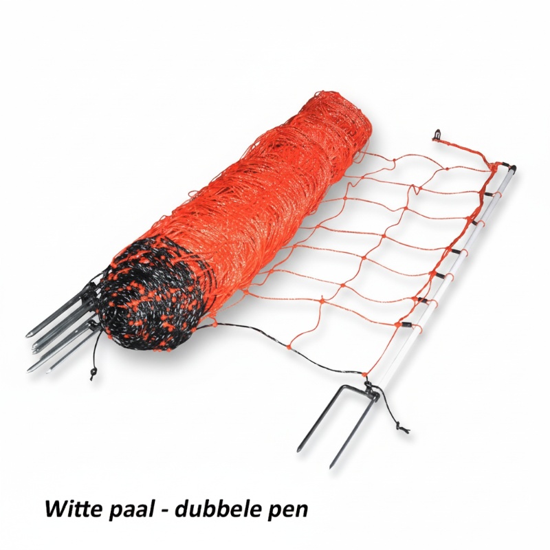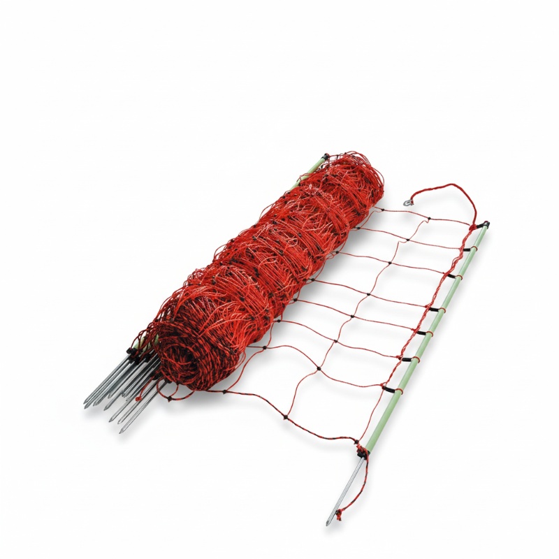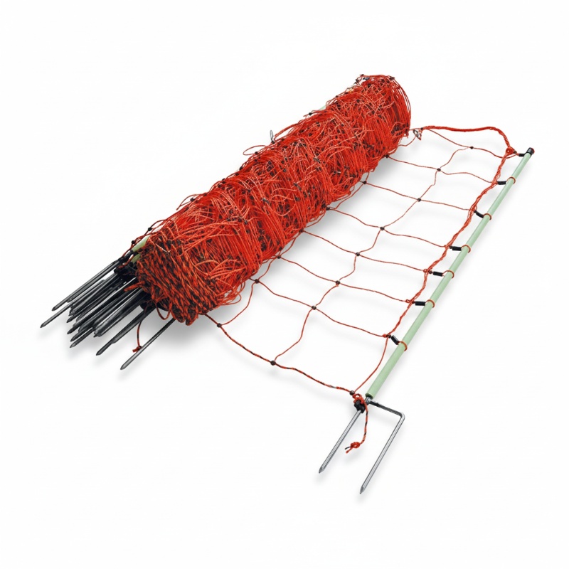 Een elektrisch afrasteringsnet van 50 meter en 90 cm hoog, bedoeld om schapen en lammeren binnen de weide te houden en pasgeboren lammeren veilig langs sloten of percelen te laten lopen. Het net is oranje van kleur en de palen zijn al in het net gemonteerd; palen zijn 90 cm hoog en het net wordt geleverd met keuze uit enkel- of dubbelgepente palen, ook beschikbaar in wit.
