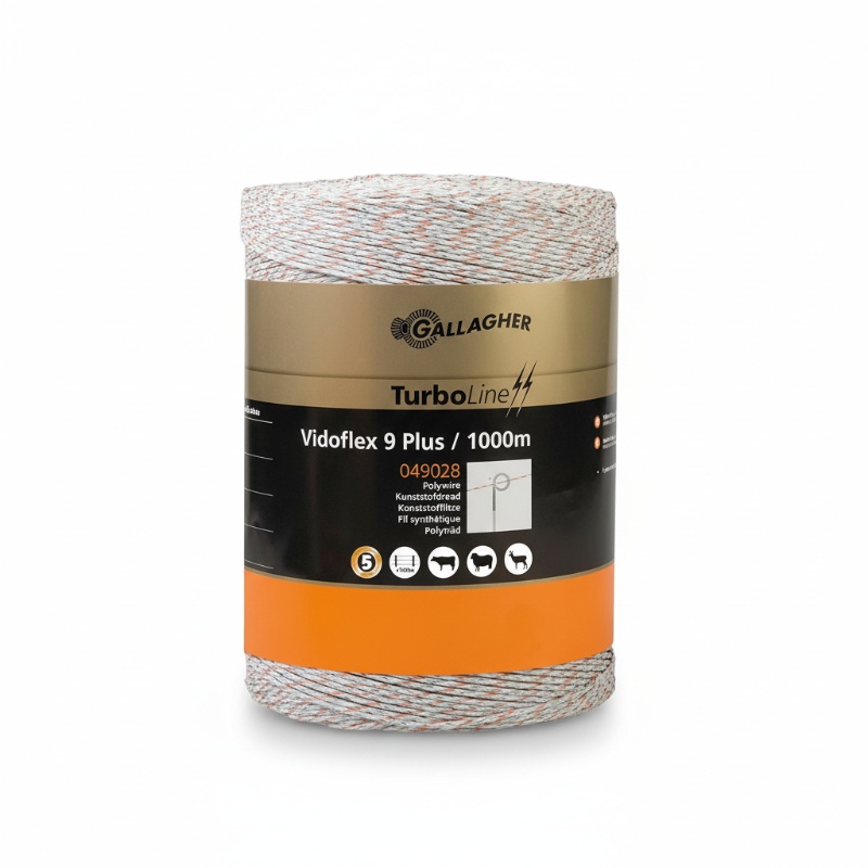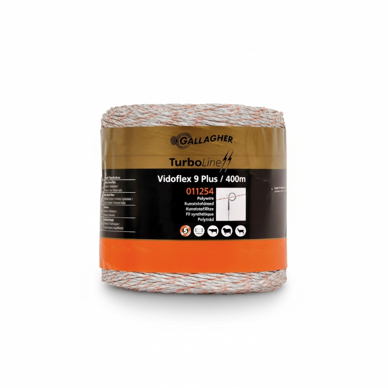 Vidoflex 9 TurboLine Plus kunststofdraad, wit, verkrijgbaar op rol van 200, 400 of 1000 m. Bestaat uit 12 nylon draden, 6 roestvrijstalen geleiders (ø 0,16 mm) en 3 vertinde koperdraadjes (ø 0,25 mm), weerstand 0,06 Ω/m, treksterkte 105 kg. Lage weerstand zorgt voor betere geleiding over lange afstanden; geschikt voor verplaatsbare en permanente afrasteringen vanaf ~500 m.